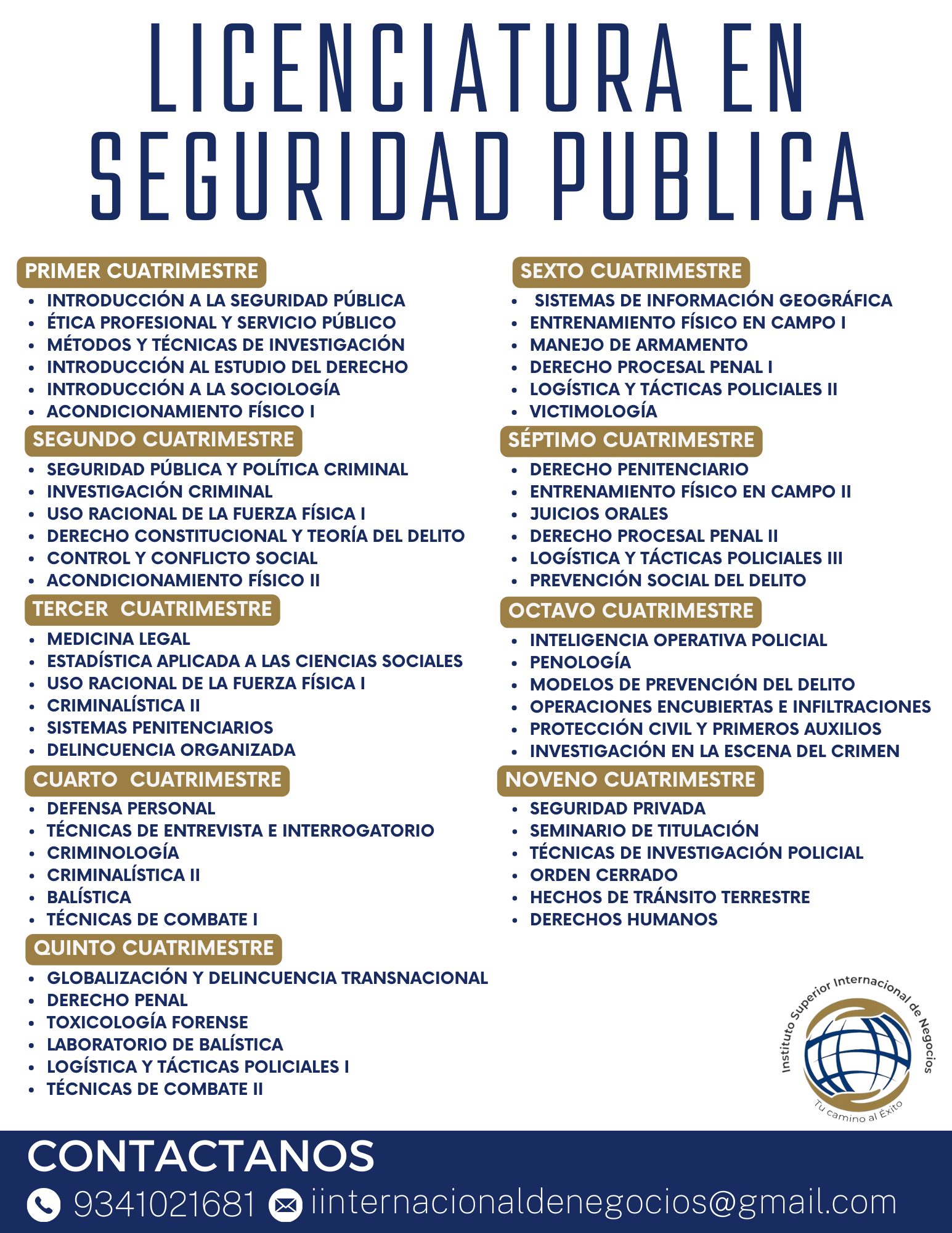 La Licenciatura en Seguridad Pública busca formar profesionales con un amplio conocimiento de las ciencias de la seguridad y la justicia, así como habilidades técnicas y competencias necesarias para desempeñarse con éxito en el campo laboral. Se espera que los egresados sean capaces de analizar y comprender los fenómenos delictivos, aplicar técnicas de investigación criminal, diseñar e implementar estrategias de prevención y control del delito, gestionar riesgos y coordinar acciones de seguridad. Además, se espera que los egresados tengan habilidades de comunicación efectiva, trabajo en equipo, toma de decisiones éticas y respeto por los derechos humanos.
